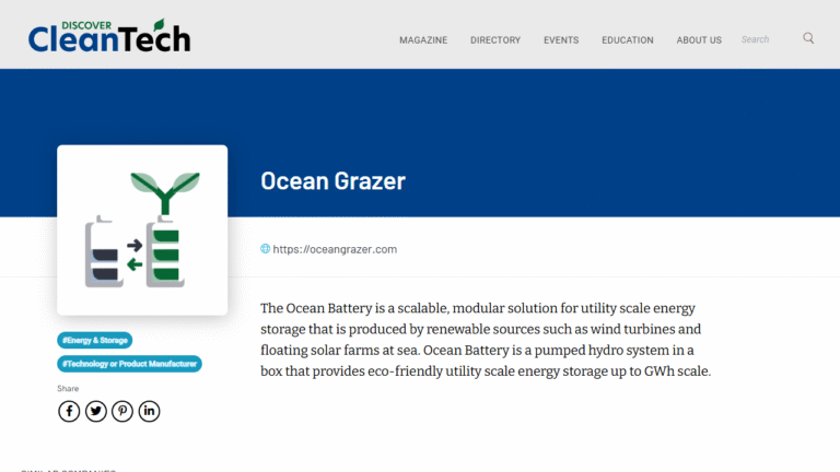 The Ocean Battery is a scalable, modular solution for utility scale energy storage that is produced by renewable sources such as wind turbines and…
