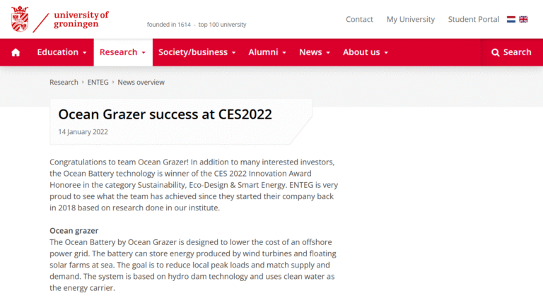 The Ocean Battery technology is winner of the CES 2022 Innovation Award Honoree in the category Sustainability, Eco-Design & Smart Energy.